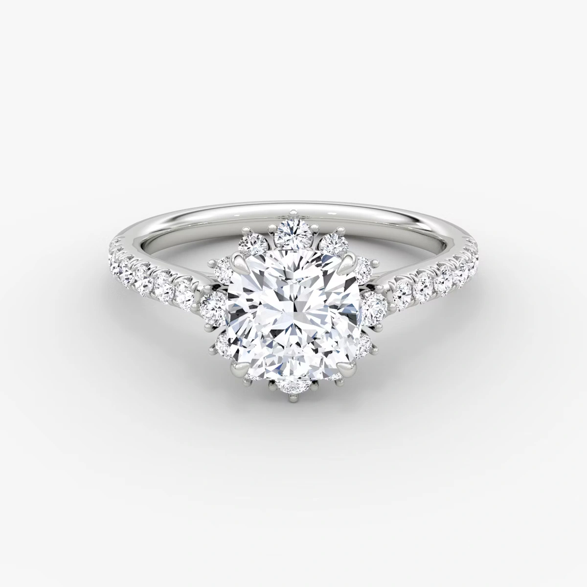 The center diamond is gently lifted and surrounded by a pavé-set diamond halo, enhancing its shape and maximizing its brilliance.