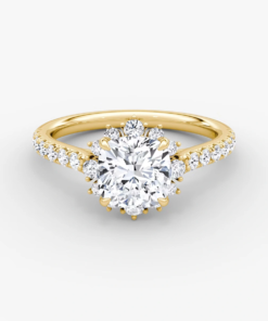 The Halo design features pavé-set diamonds encircling the center stone, enhancing its visual impact and radiance.