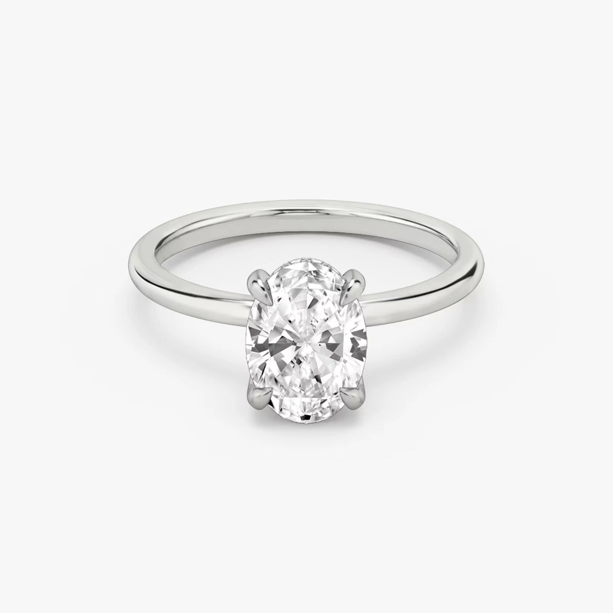 The iconic Oval-cut diamond is paired with clean and elegant band lines, blending modern simplicity with timeless grace.