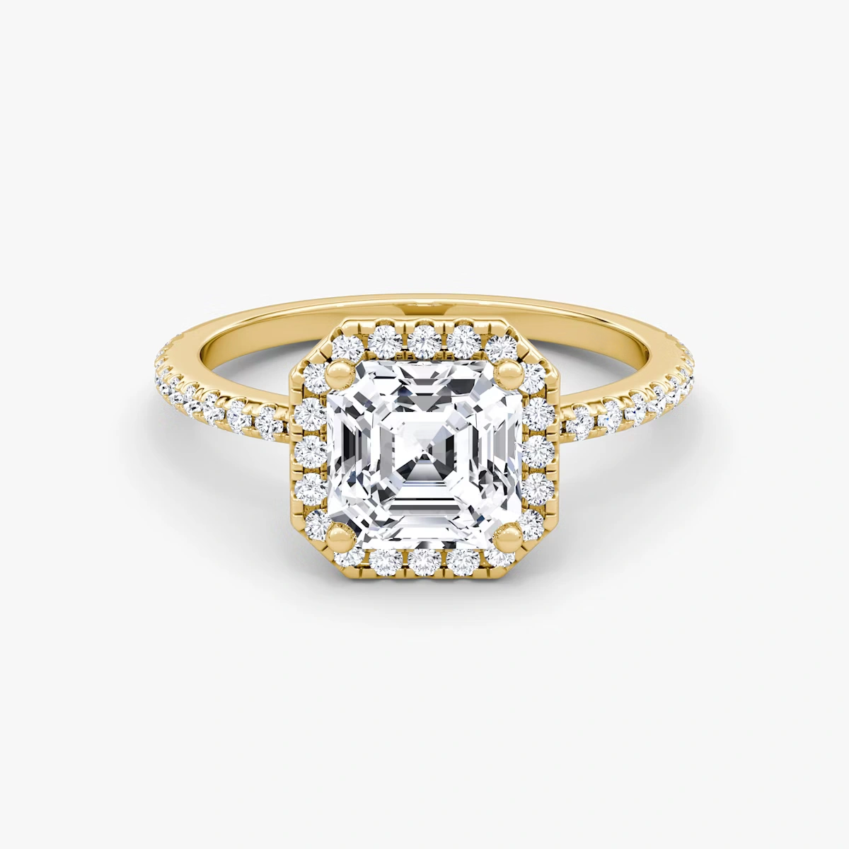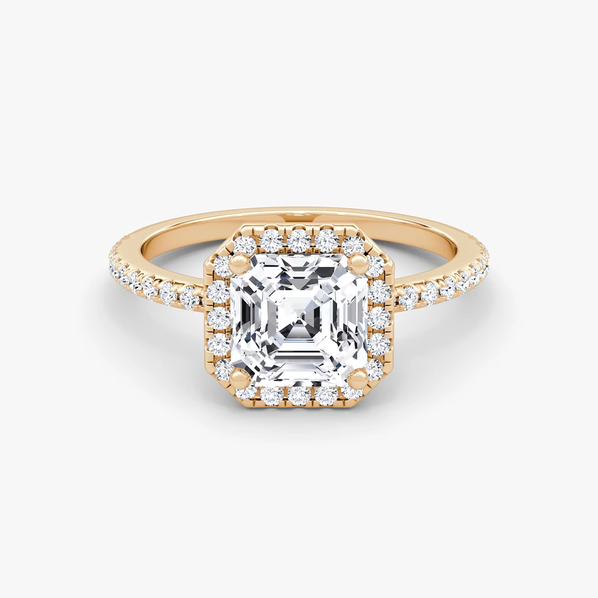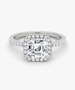 This ring, crafted in 14k gold with a Asscher-cut diamond and a classic Halo pavé design, perfectly blends modern elegance with timeless charm, making it the ideal symbol of love and commitment.”