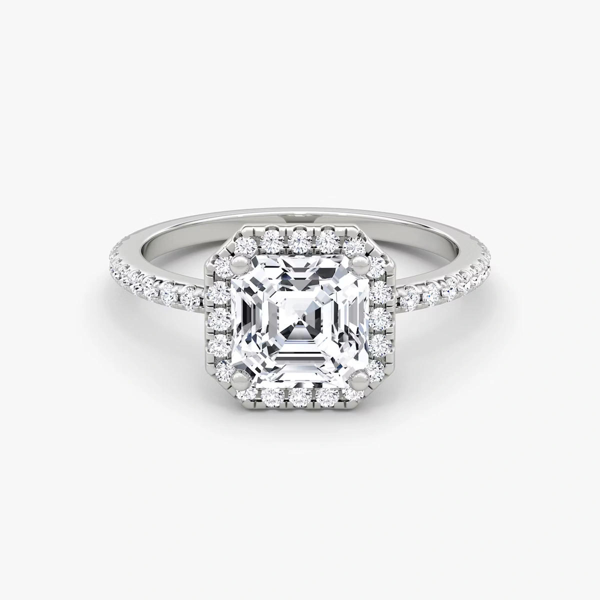 The center diamond is a classic Asscher-cut, further enhanced by the hand-set halo diamonds that amplify its brilliance and sparkle.