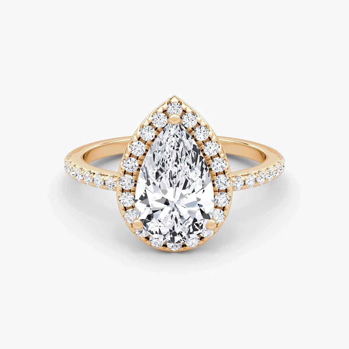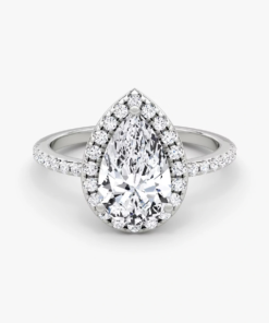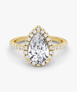 This ring, crafted in 14k gold with a Pear-cut diamond and a classic Halo pavé design, perfectly blends modern elegance with timeless charm, making it the ideal symbol of love and commitment.”