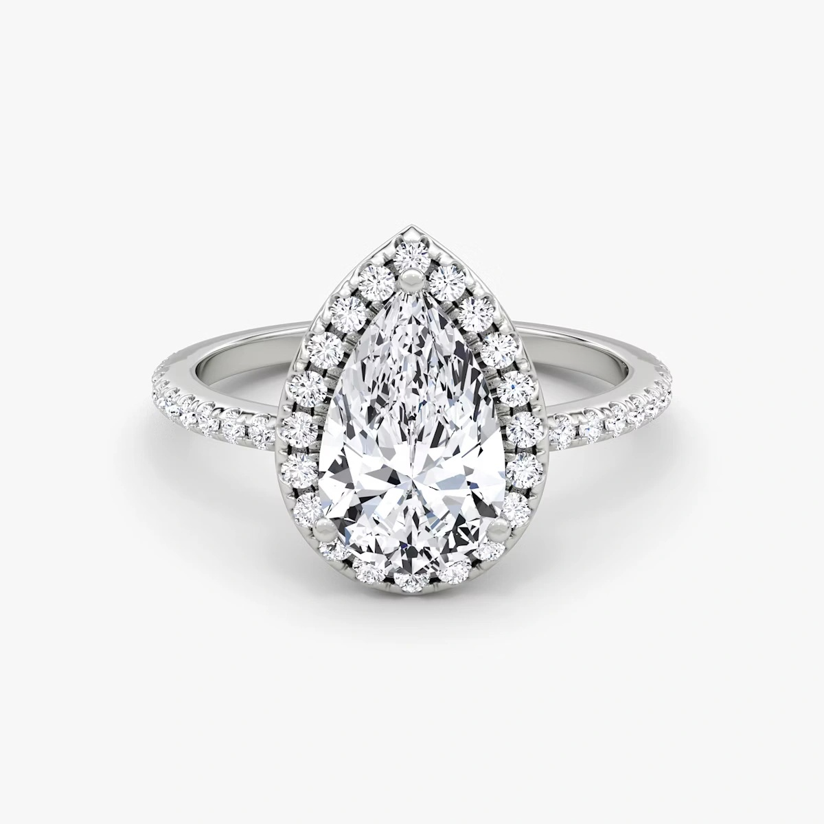 The center diamond is a classic Pear-cut, further enhanced by the hand-set halo diamonds that amplify its brilliance and sparkle.