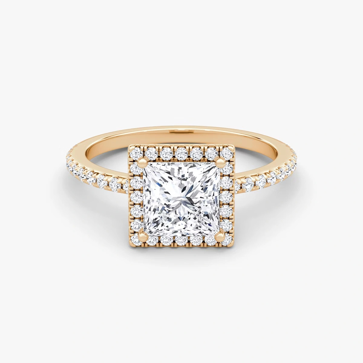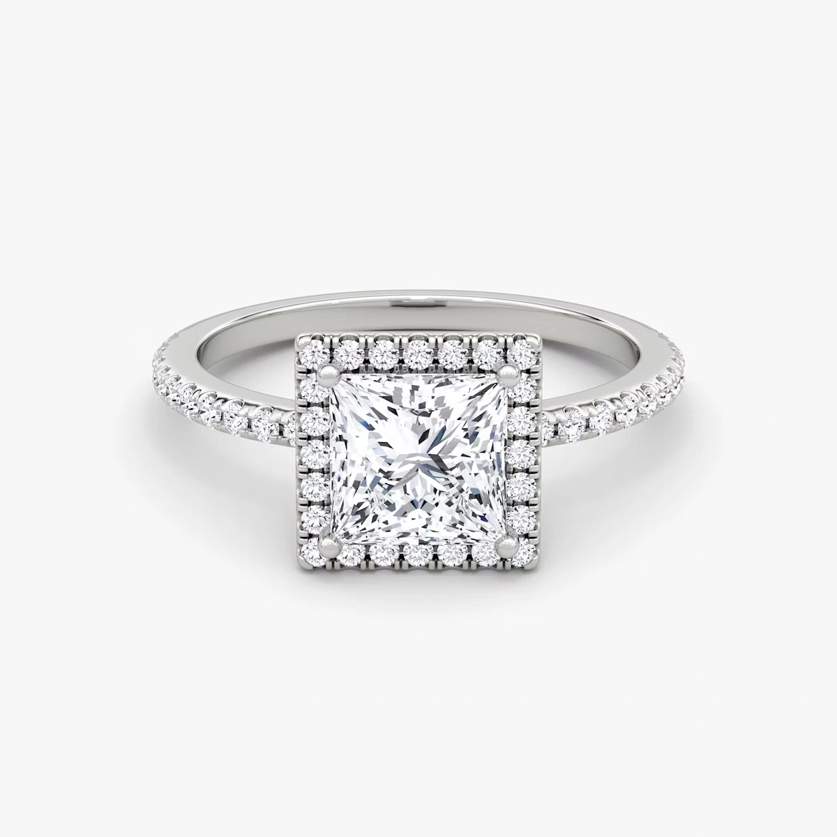The center diamond is a classic Princess-cut, further enhanced by the hand-set halo diamonds that amplify its brilliance and sparkle.