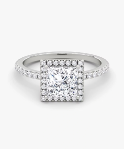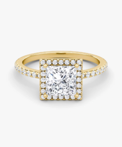This ring, crafted in 14k gold with a Princess-cut diamond and a classic Halo pavé design, perfectly blends modern elegance with timeless charm, making it the ideal symbol of love and commitment.”
