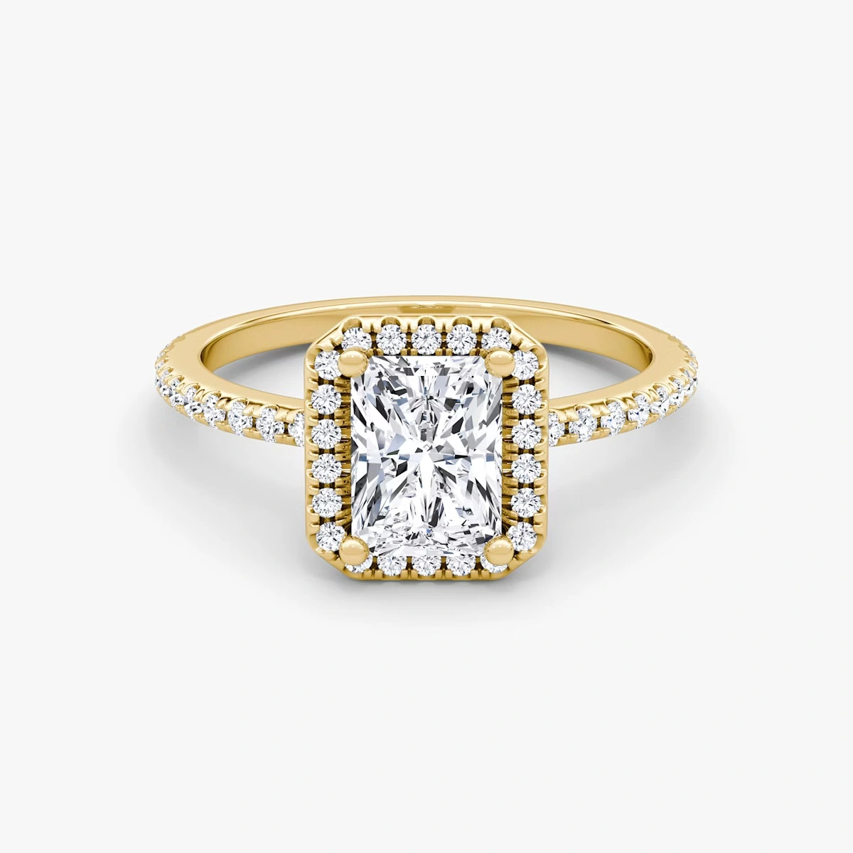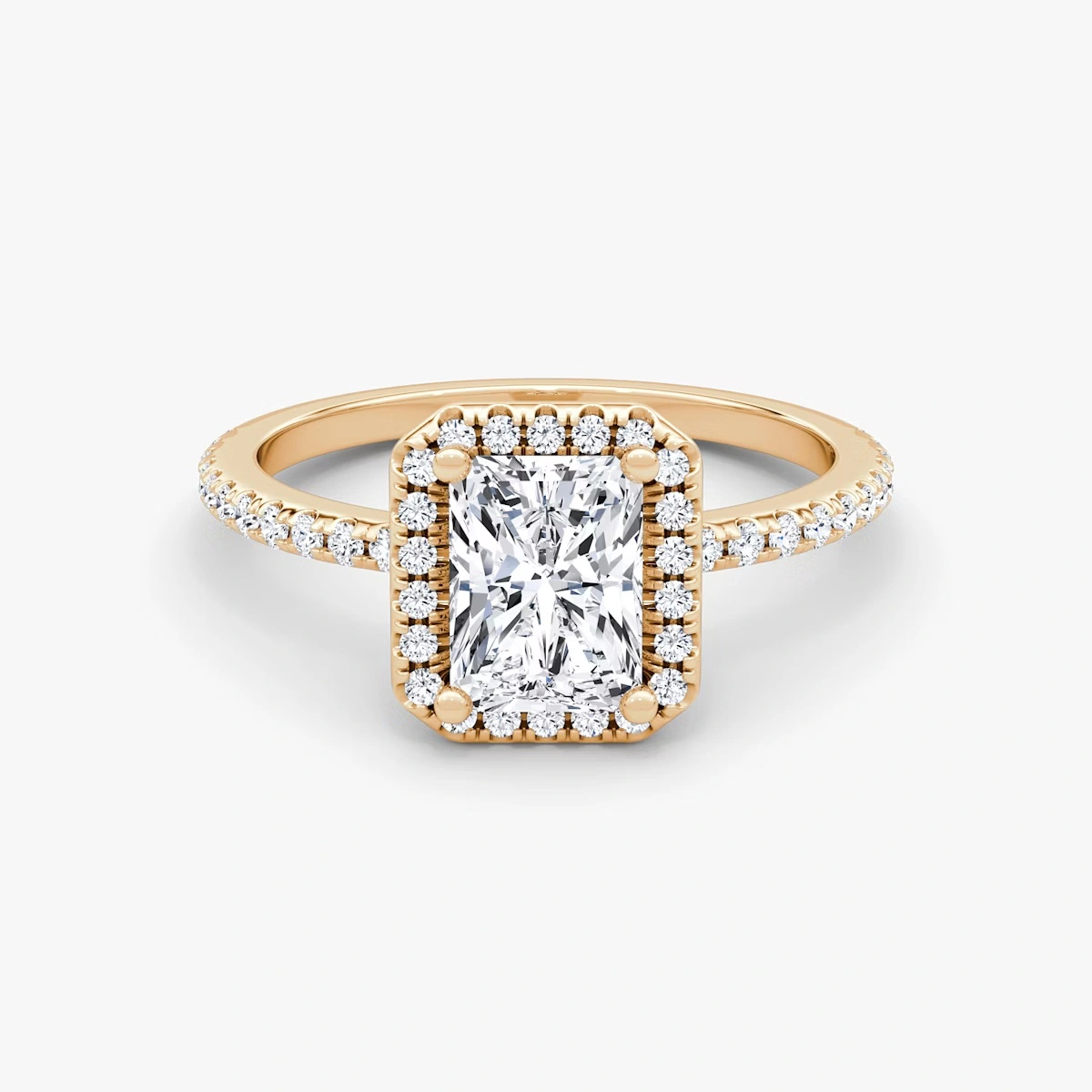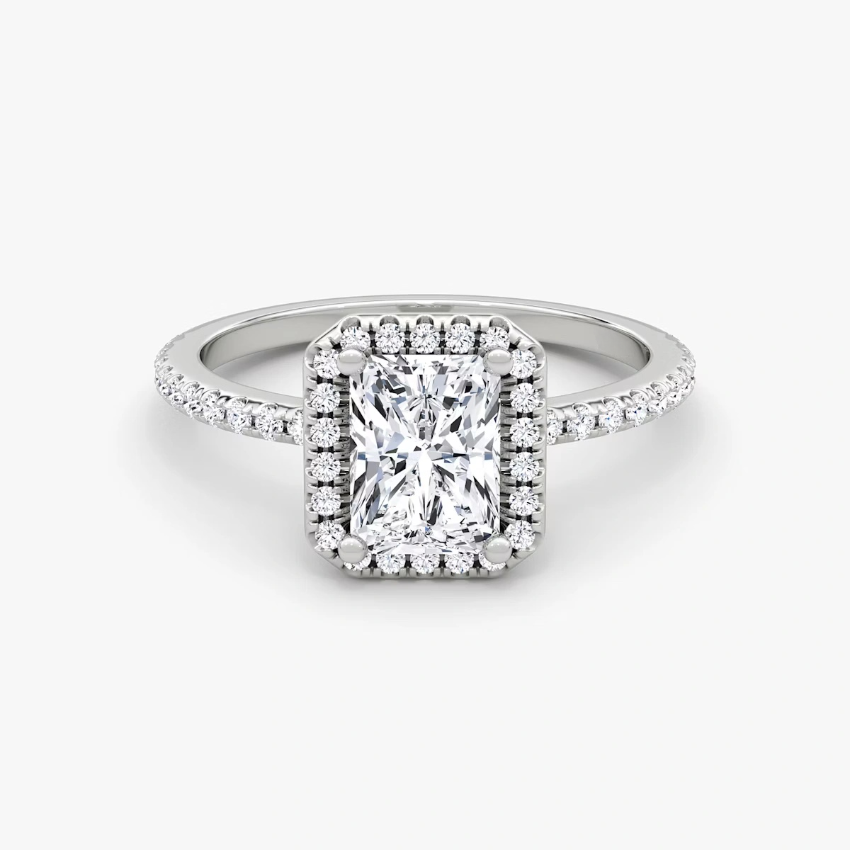 The center diamond is a classic Radiant-cut, further enhanced by the hand-set halo diamonds that amplify its brilliance and sparkle.