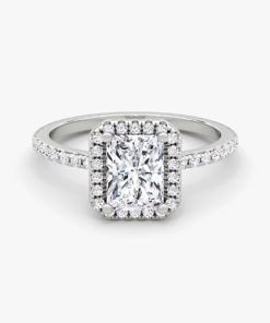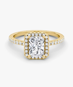 This ring, crafted in 14k gold with a Radiant-cut diamond and a classic Halo pavé design, perfectly blends modern elegance with timeless charm, making it the ideal symbol of love and commitment.”