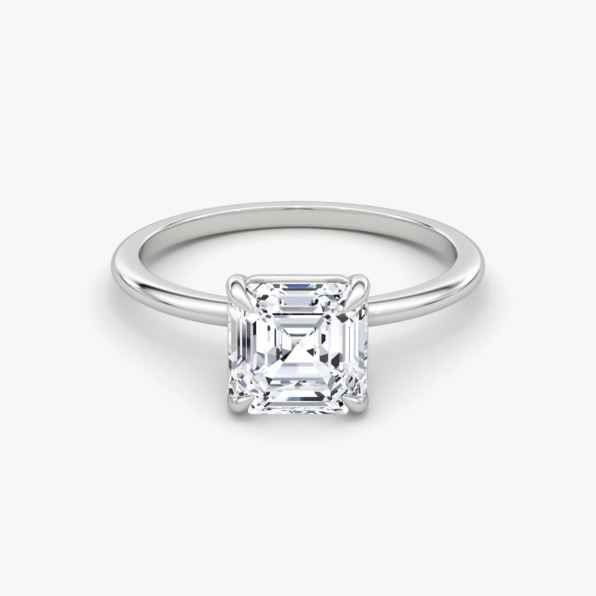 Set with an Asscher-cut diamond, renowned for its mesmerizing geometric steps and captivating brilliance.