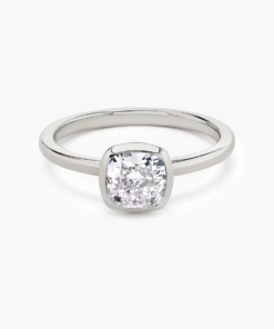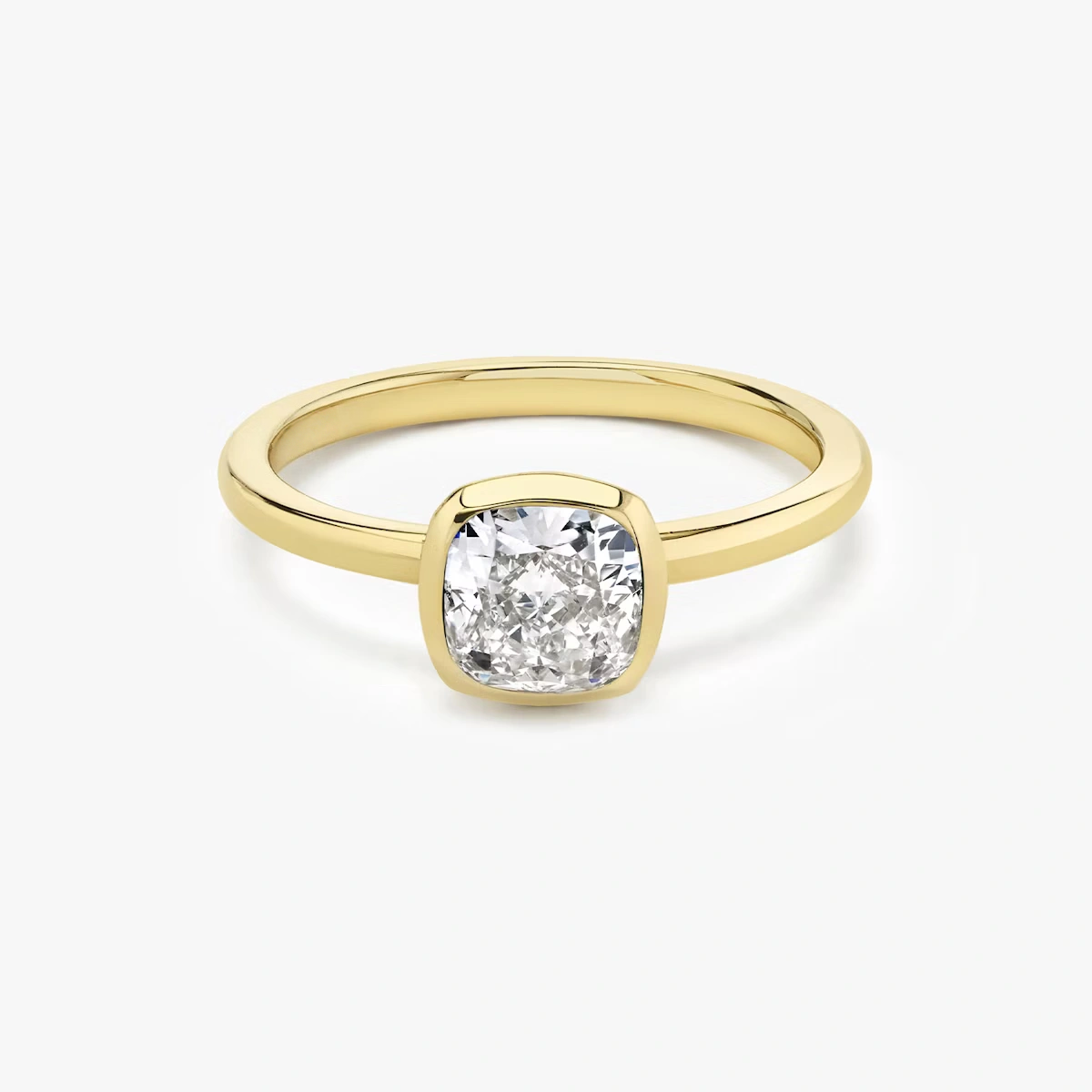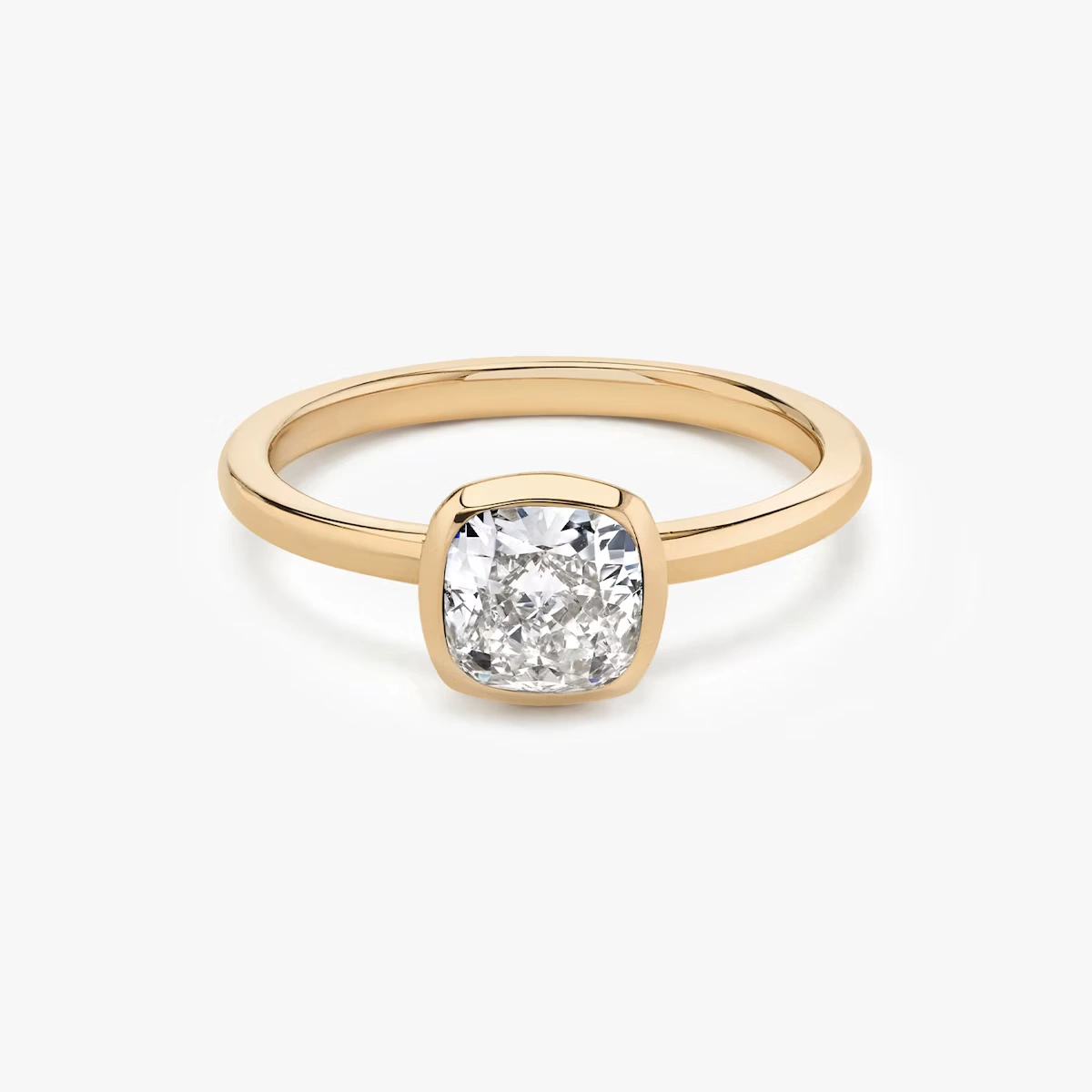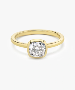This ring, crafted in 14k gold with an Cushion-cut diamond and classic bezel design, perfectly merges modern elegance with historic charm, making it the ideal symbol of timeless love and style.”