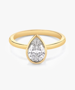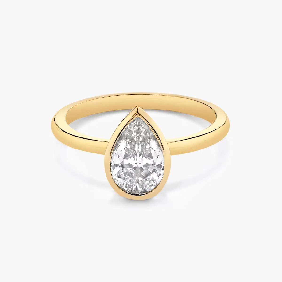 This ring, crafted in 14k gold with an Pear-cut diamond and classic bezel design, perfectly merges modern elegance with historic charm, making it the ideal symbol of timeless love and style.”