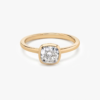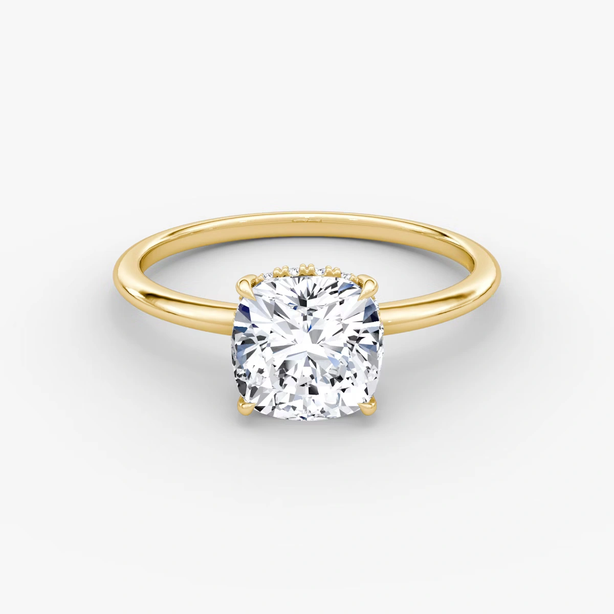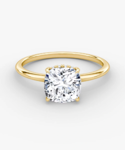 This ring, crafted in 14k gold with an Cushion-cut diamond, four-prong design, and hidden halo, blends modern comfort with timeless elegance, making it the perfect symbol of love and refined taste.”