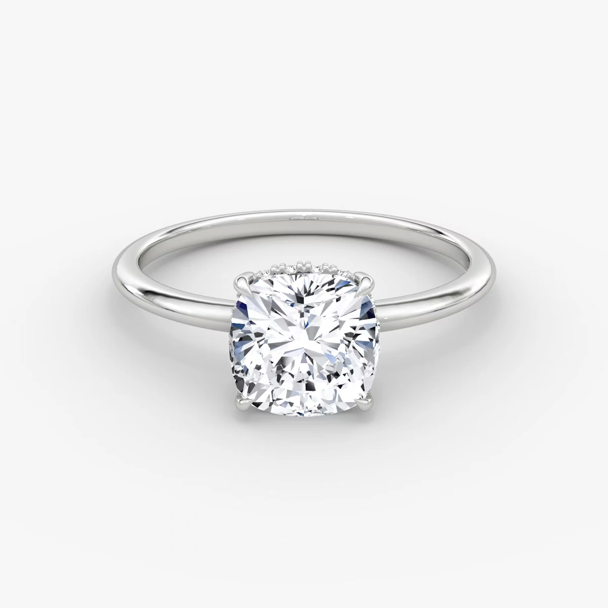 The combination of the four-prong setting and hidden halo pairs seamlessly with other wedding bands for a polished and elegant look.