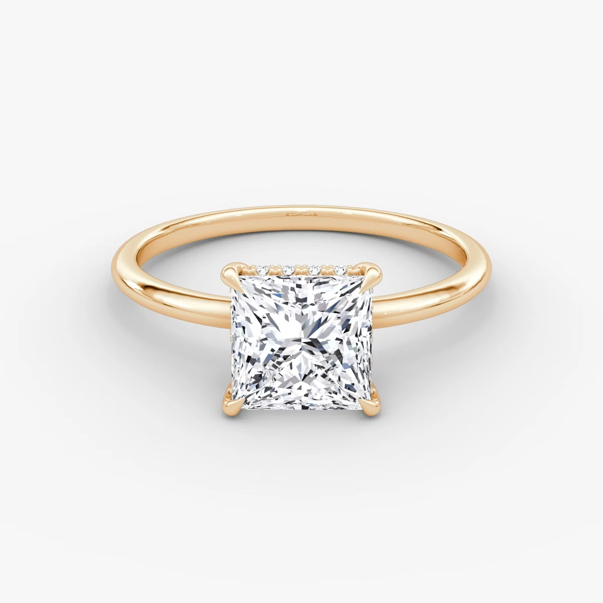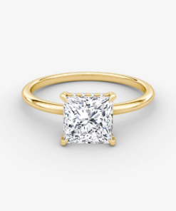This ring, crafted in 14k gold with an Princess-cut diamond, prong setting, and hidden halo design, combines modern elegance with timeless charm, making it the perfect symbol of love and style.”