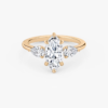 The center diamond is a Marquise-cut, designed to sit low on the finger for a seamless pairing with wedding bands.