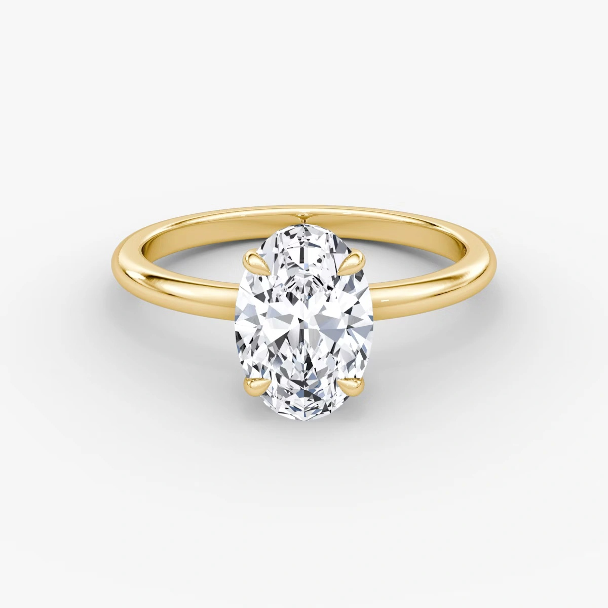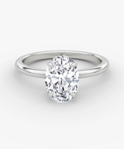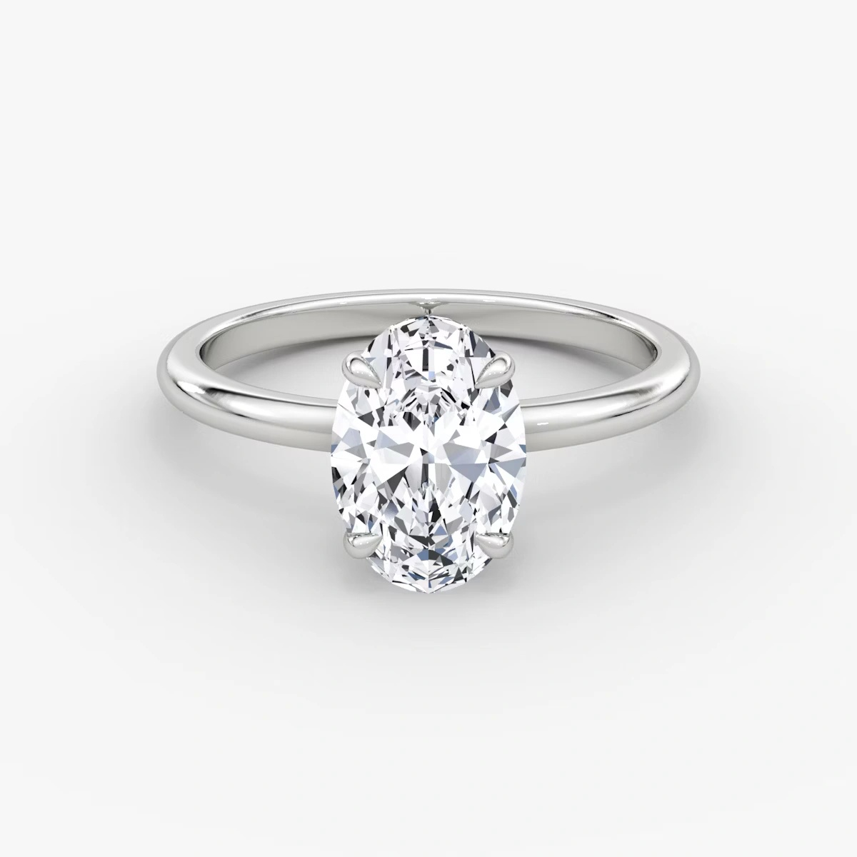 The center diamond is a Oval-cut, designed to sit low on the finger for a seamless pairing with wedding bands.