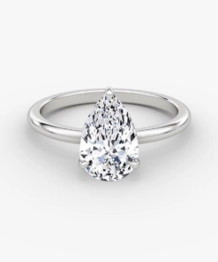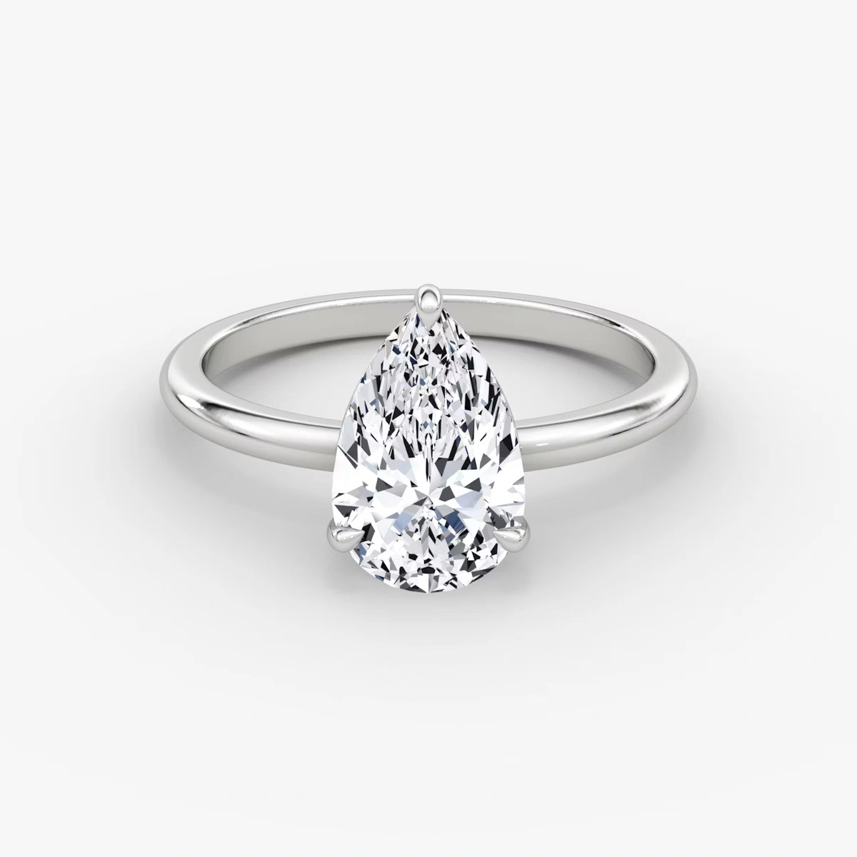 The center diamond is a Pear-cut, designed to sit low on the finger for a seamless pairing with wedding bands.