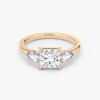 The center diamond is a Princess-cut, designed to sit low on the finger for a seamless pairing with wedding bands.