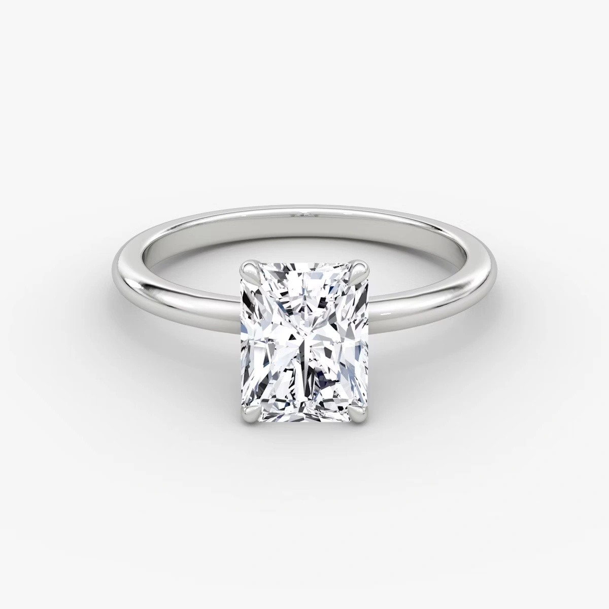 The center diamond is a Radiant-cut, designed to sit low on the finger for a seamless pairing with wedding bands.