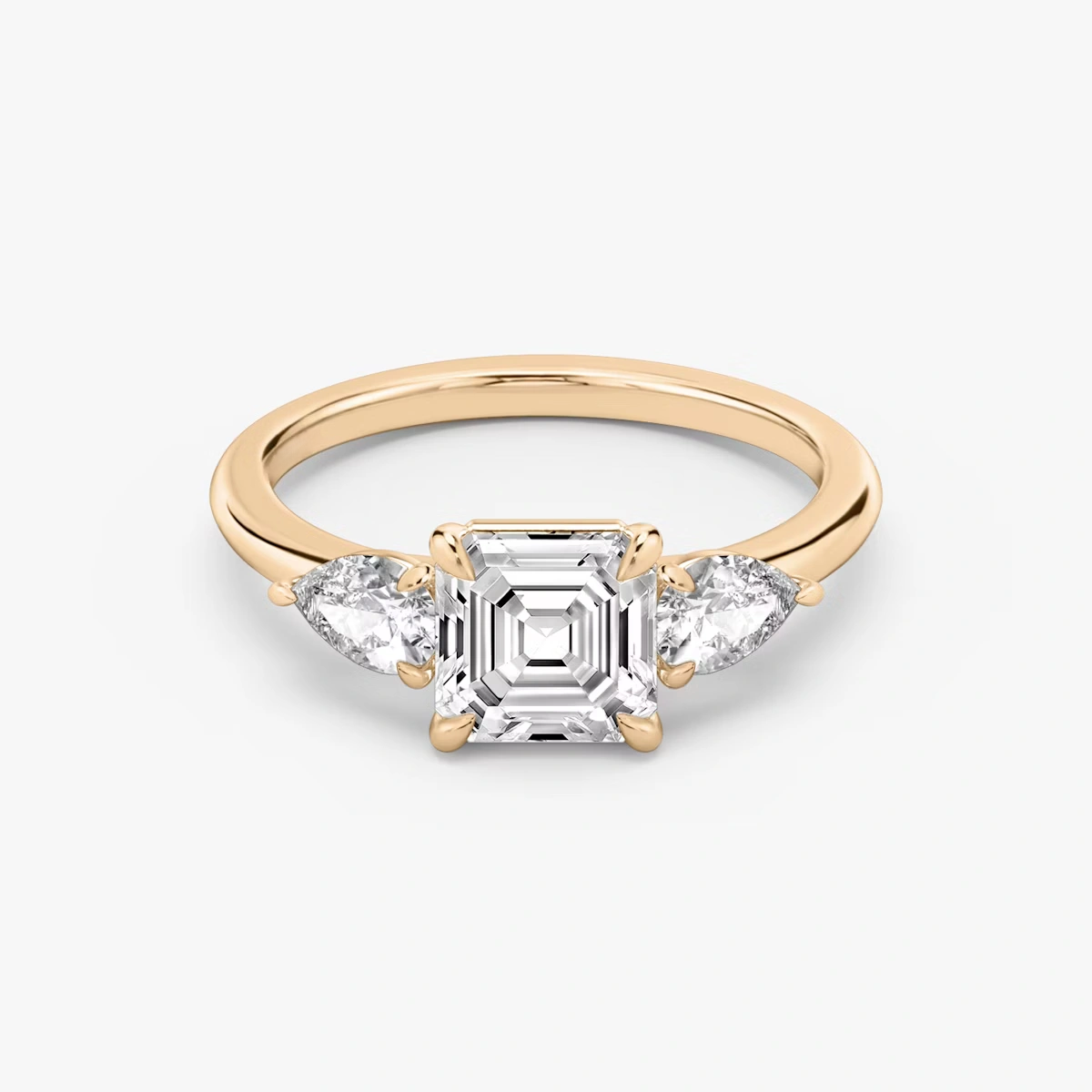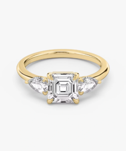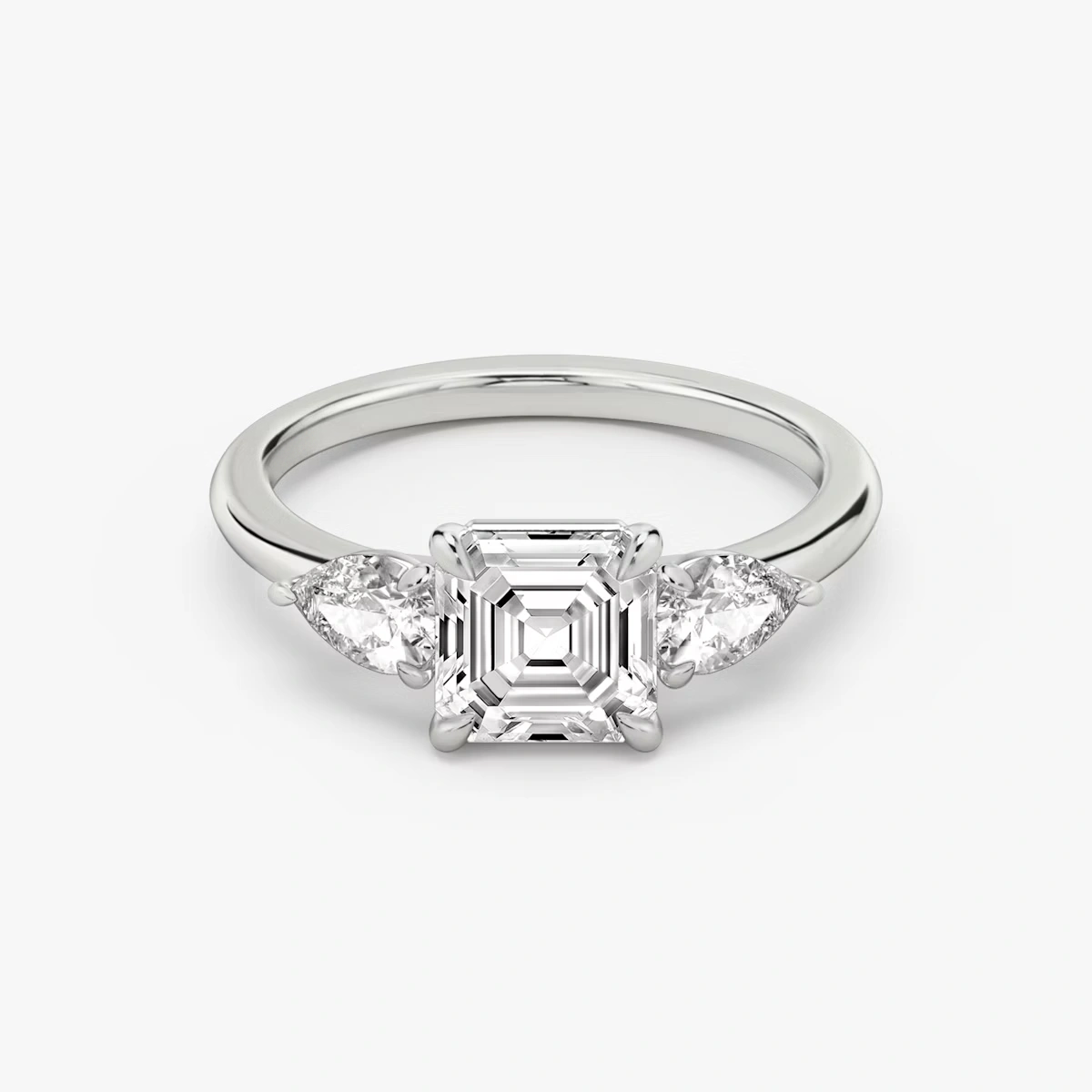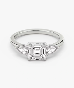 Features a classic Asscher-cut center diamond flanked by two exquisite 0.25ct pear-cut diamonds, enhancing the brilliance and elegance of the centerpiece.