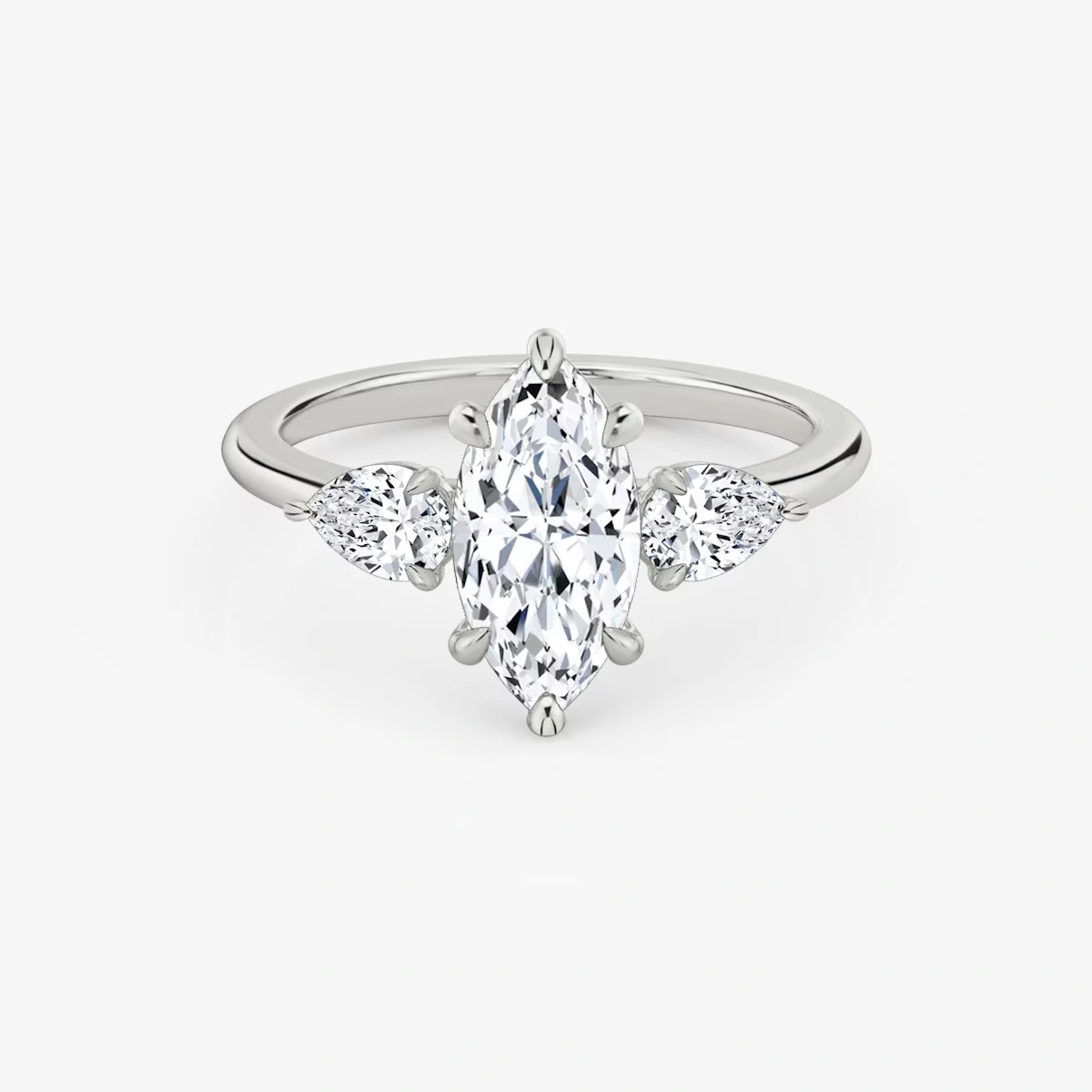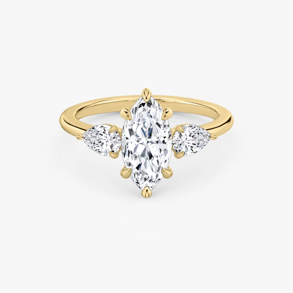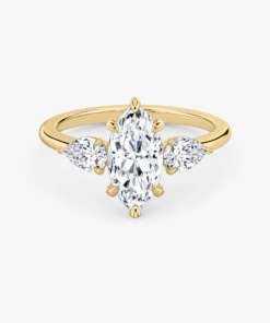 Features a classic Marquise-cut center diamond flanked by two exquisite 0.25ct pear-cut diamonds, enhancing the brilliance and elegance of the centerpiece.